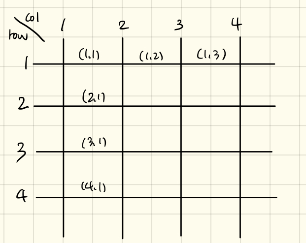 이후에는 아래 그림과 같이 좌표로 보고 풀기 시작했다. 세로 1~2 사이에 있는 애들은 col 1로 보고 완전탐색 dfs를 시작해보자!