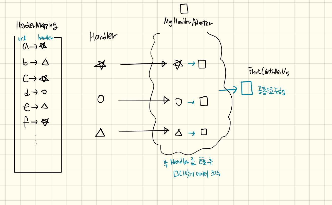 - 핸들러 : (구 컨트롤러) 어댑터가 존재하기 때문에 꼭 컨트롤러의 개념이 아니어도 어떠한 것이든 해당하는 종류의 어댑터만 있으면 다 처리할 수 있다.